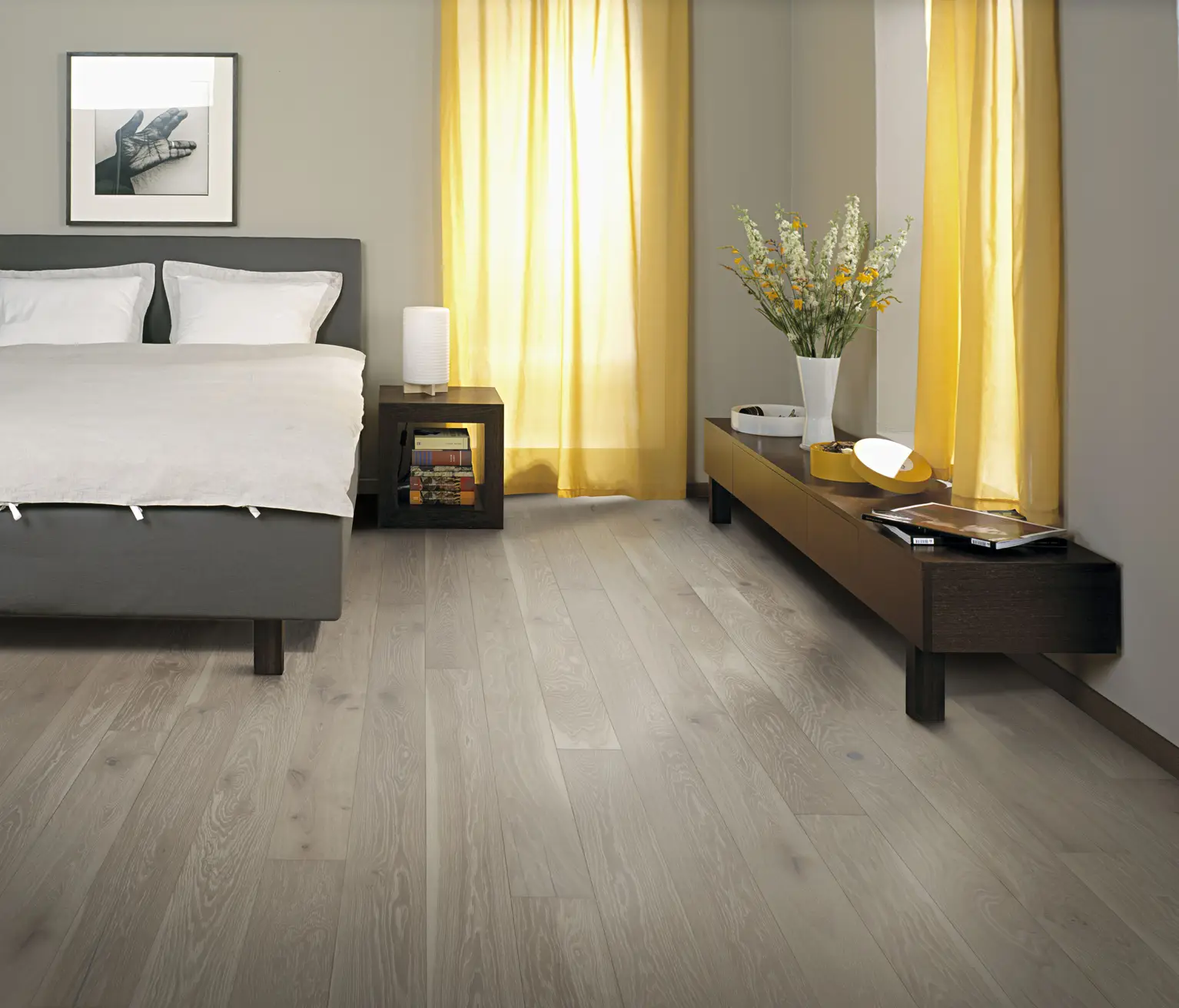Szare podłogi drewniane emanują ponadczasową elegancją i dopasowują się do różnych stylów wnętrz, od nowoczesnych po tradycyjne. Ich neutralna uniwersalność harmonijnie współgra z różnymi schematami kolorystycznymi i pozwala na twórczą aranżację. Dzięki głębi wizualnej i naturalnym słojom drewna, szare podłogi wprowadzają przytulną atmosferę. Jaśniejsze odcienie mogą dodatkowo optycznie powiększyć przestrzeń i rozświetlić wnętrze. Są łatwe w utrzymaniu, modne i trwałe, stanowiąc niezawodne rozwiązanie podłogowe.